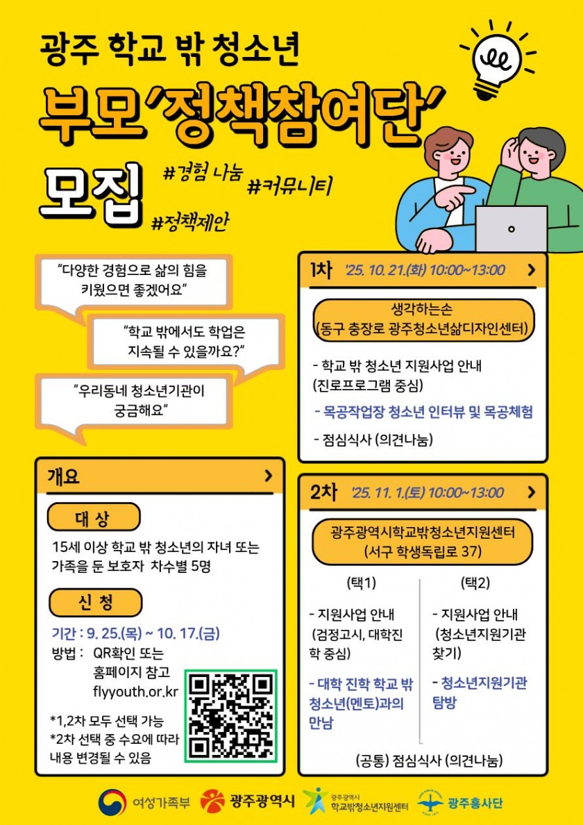 공지사항 광주 학교 밖 청소년 부모 정책 참여단 모집