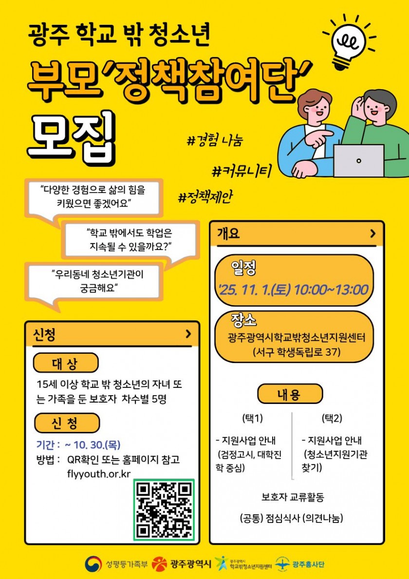 공지사항 (추가) 광주 학교 밖 청소년 부모 정책 참여단 모집