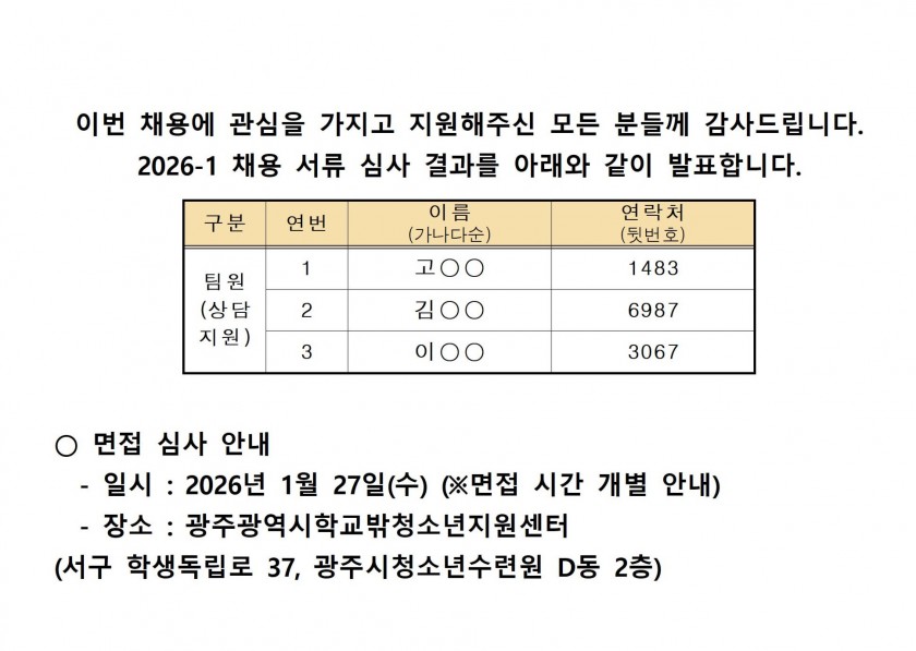 2026-1 채용 서류심사에 합격자를 붙임과 같이 안내합니다.
