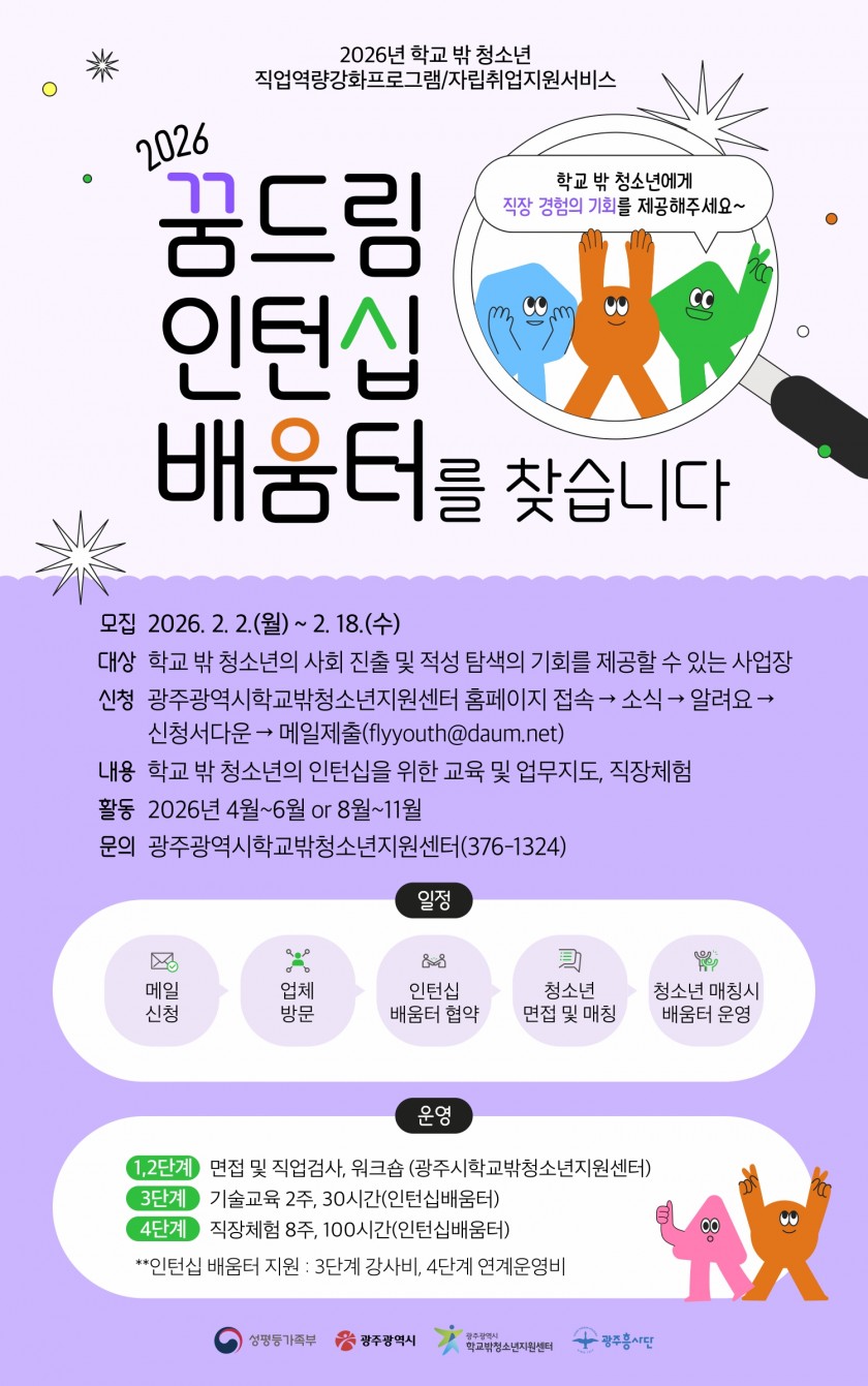 공지사항 2026년 학교밖 청소년 꿈드림인턴십배움터 모집